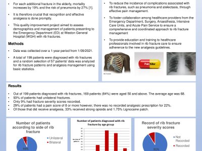 Introduction Rib fractures are very common worldwide, particularly in the elderly due to the increased risk of fragility fractures. They are associated with significant morbidity and mortality, largely due to respiratory complications secondary to pain. For each additional fracture in the elderly, mortality increases by 19% and the risk of pneumonia by 27% . It is therefore crucial that recognition and effective analgesia is done promptly. This quality improvement project aimed to assess demographics and management of patients presenting to the Emergency Department (ED) at Weston General