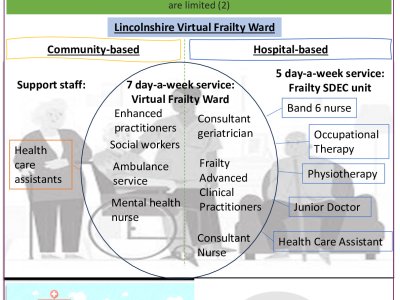 Introduction: Virtual frailty wards, where patients are treated at home who otherwise would be in an acute hospital, are a model of care being promoted within the NHS in the UK, with the aim to ‘provide an alternative to admission and/or early discharge’. The evidence base for this model of care is limited and the ideal set up has not been defined. The aim is to describe the implementation and delivery of a virtual frailty ward serving a rural community. Methods: Creating a 7 day a week frailty virtual ward integrated across primary and secondary care. A multidisciplinary team (MDT) focus was