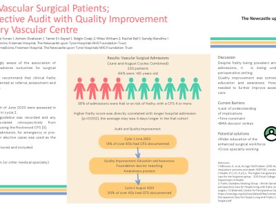 Background Clinicians are increasingly aware of the association of frailty syndrome and adverse outcomes. The British Geriatric Society recommends that clinical frailty scores (CFS) are assessed for all patients on admission to surgery, to optimise peri-operative care. Method For in-patients over one month (June 2023), the concordance with guidelines was recorded and any ‘missing’ scores retrospectively completed (Rockwood CFS). Clinical metrics included length of stay. Results 110 patients were admitted under vascular surgery. The median age was 67 (IQ 61-79). 73 (66%) were aged >65-years and
