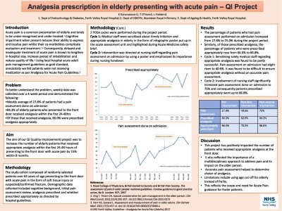Introduction: Acute pain is a common presentation of elderly and tends to be under-recognised and under-treated. Consequently, delayed and inadequate treatment of acute pain is known to lengthen in-hospital stay whilst reducing quality of life. Using local hospital guidelines for acute pain management in adults as gold standard, anecdotally we felt patients were not received medication as per guidance. A quality improvement project was undertaken with an aim to increase the number of patients >65 years old that received appropriate analgesia within the first 24-48 hours of presenting to the