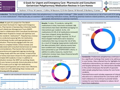 Introduction The World Health organisation states that polypharmacy is a major global challenge. Older people in care homes are at risk of harm with 91% taking 5 or more medications. Pharmacists play an essential role in conducting medication reviews, identifying potential drug related problems, and implementing appropriate interventions to optimise treatment. Method As part of a pilot project for The Welsh Government Six Goals For Urgent and Emergency Care Pharmacists in Swansea Bay University Health Board’s Medicines Management team worked in collaboration with Consultant Geriatricians at