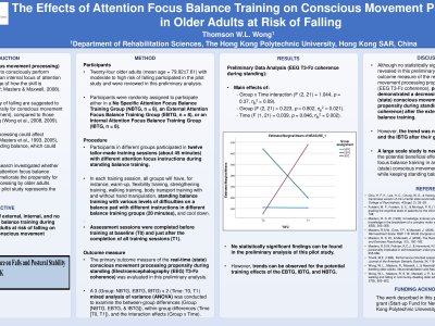 Introduction Keeping our standing balance is a crucial capability in preventing falls. Nevertheless, older adults may focus attention internally to their movement mechanisms during stance, through conscious movement processing (CMP), when facing balance difficulties. However, this may interfere with movement automaticity that could cause balance problems. The primary aim of this pilot study is to examine the effects of attention focus balance training on CMP propensity in older adults at risk of falling. Method Twenty-four older adults (mean age = 79.92 ± 7.61) with moderate to high risk of