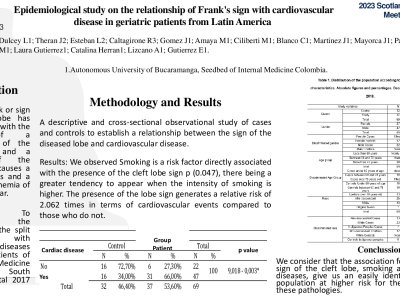 Introduction: The sign of Frank or sign of the cleft lobe has been associated with the existence of a disorganization of the elastic fibers and a thickening of the arterioles that causes a vascular sclerosis and a chronic local ischemia of the lobe of the ear. Objectives: To determine the relationship of the split lobe sign with cardiovascular diseases in geriatrics patients of the Internal Medicine service of a Southamerican hospital 2017 to July-2018. Methodology: A descriptive and cross-sectional observational study of cases and controls to establish a relationship between the sign of the