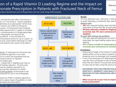 Introduction Fracture prevention is a key component in the care of frail patients who fall. Patients that have already fallen and suffered a fractured neck of femur are highly likely to fall again, and have proven themselves high risk for fracture. Bone protection is a priority, and recent guidelines recommend IV Bisphosphonates as an appropriate 1st line drug. Vitamin D level should be 50 or above before this is given. Method: I audited the notes of 41 patients age 60 years or over who were admitted in 2022 with a fractured neck of femur. I reviewed their admission Vitamin D level, and