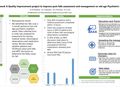Introduction: Falls are a leading cause of mortality and morbidity in older people and the risk of falling is exacerbated by underlying mental health conditions and associated treatments. NICE recommends that people who fall should undergo multifactorial assessment including a post-fall protocol with assessment for injury before being safely moved, a timely medical examination (within a maximum of 12 hours or 30 minutes if fast-tracked), neurological observations (if there is suspicion of head injury or unwitnessed fall) and a medication review. Aim: We aimed to assess the quality of post