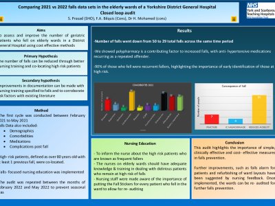 Aims This closed loop audit aims to primarily assess and improve the number of geriatric patients who fell on elderly wards in a District General Hospital using cost effective methods. The secondary aim is to improve documentation of falls and assess for contributing factors. Hypothesis The primary hypothesis is that number of falls can be reduced through better nursing training and co-locating high risk patients. The secondary hypothesis is that improvements in documentation can be made with nursing training specified to falls and to corroborate risk factors with existing literature. Methods
