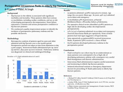 Background Hip fracture in the elderly is associated with significant morbidity and mortality. These patients often have serious co-morbidities, including cardiac conditions, and are at risk of developing perioperative decompensation. Heart failure represents a common and serious perioperative condition in hip fracture patients1. We conducted a quality improvement project to identify incidence of perioperative pulmonary oedema and the possible risk factors. Method Retrospective analysis of patients aged 60 years and older admitted with hip fracture over a one month period. Perioperative period