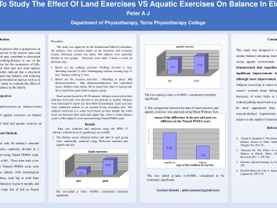 Abstract: Ageing is a complex biological process that is progressive in nature. There is a decline observed in the muscle mass and the sensorimotor systems which may contribute to decreased balance and stability while walking.Balance is one of the most crucial intrinsic risk factor for the occurrence of falls. Falls are the leading cause of fatal and non fatal injuries among the elderly.Multiple studies indicate that a structured exercise program helps in improving balance and reducing risk of falls.Exercises can be performed on land as well as in water.Thereby the need of the study to
