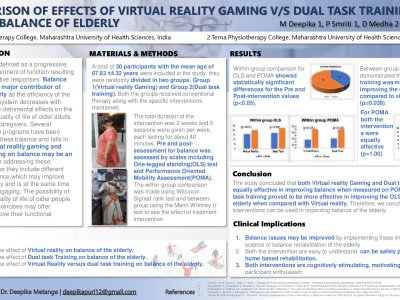 Introduction:Aging has been defined as a progressive, generalized impairment of function resulting in a loss of adaptive responses.Balance impairment is a major contributor to falling in elderly as efficiency of postural control system decreases with aging.Several different exercise programs have been suggested to address balance and falls in elderly.Virtual reality gaming and dual task training on balance may be an effective tool for addressing these problems because it includes different elements of balance which may improve functional mobility and is at the same time enjoyable and engaging