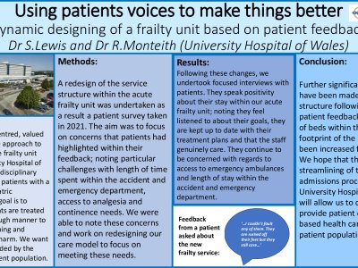 Introduction Using a patient centred, valued based health care approach to reshape the acute frailty unit with the University Hospital of Wales. Our multi-disciplinary team provide our patients with a compressive geriatric assessment. The goal is to ensure our patients are treated in a timely, thorough manner to avoid deconditioning and hospital induced harm. We want our unit to be guided by the needs of our patient population. Methods A redesign of the service structure within the acute frailty unit was undertaken as a result a patient survey taken in 2021. The aim was to focus on concerns