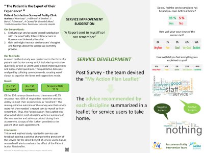 Rationale: The Frailty Intervention Team (FIT) is a multidisciplinary team that provides a service to community based frail adults. This particular service is novel in the sense that it is a hospital based out-patient service as opposed to a frailty at the front door or a community based service, and has access to rapid diagnostic and intervention services. As this is a novel service a qualitative study was undertaken to assess patient satisfaction and guide the direction and development of future quality improvements initiatives. Objective: To evaluate the satisfaction of service users with