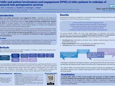 Introduction Patient and public involvement and engagement (PPIE) is essential to delivering patient centred, quality research. Older adults constitute an increasing proportion of the surgical population but are unintentionally excluded from traditional models of engagement. We describe the process and outputs of conducting PPIE to support future research examining the scale up of CGA-based perioperative services such as POPS (Perioperative medicine for Older People undergoing Surgery). Methods Patients undergoing elective surgery at four NHS hospitals in England and Wales were asked to