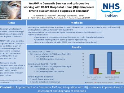 Introduction: Scotland's National Dementia strategy (2017) highlights the need to improve identification and management of dementia. Hospital at Home (H@H) teams often identify undiagnosed cognitive decline as part of comprehensive geriatric assessment. A trainee ANP in dementia services was appointed in 2019 in West Lothian; before this, the average waiting time to memory clinic assessment was 6 months for a home visit, and 12 months for outpatient clinic review. Affiliated with REACT H@H, the ANP identified a significant unmet need for assessment of cognitive decline in a patient cohort