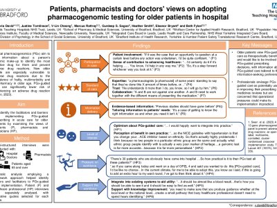 Introduction: Pharmacogenomics is using a patient’s genetic information to predict their likely response to a medicine. There is evidence that patients who receive pharmacogenomic-guided care benefit from a reduction in clinically significant adverse drug reactions. Therefore, pharmacogenomic testing can be used as a medicines optimisation tool to prevent adverse drug reactions in older people and reduce associated hospital admissions. This qualitative study aimed to identify the facilitators and barriers to implementing pharmacogenomic-guided prescribing in acute care for older patients by