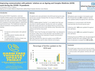 Introduction During the COVID-19 pandemic, restricted hospital visitation policies were implemented to reduce the spread of the viral infection. As a result, telephone has become the main communication method despite the complexity of the elderly patients' medical and psychosocial issues. This has heightened anxiety and reduced satisfaction among patients and their families. This quality improvement project aimed at improving communication with patients' families. We introduced several strategies with the aim to update patients' families within 48 hours of admission and then at least once a
