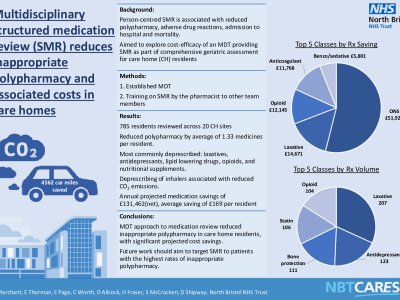 Background Person-centred structured medication review (SMR) is associated with reduced polypharmacy, adverse drug reactions (ADRs), admission to hospital and mortality. Our service development aimed to explore the cost-efficacy of a multi-disciplinary team (MDT) providing SMR as part of a comprehensive geriatric assessment for care home (CH) residents. Method We established an MDT consisting of a consultant geriatrician, specialist clinical pharmacist, two general practitioners, clinical fellow, physician associate and frailty paramedic practitioner. Training on SMR was given by the
