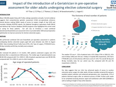 Introduction About 300,000 people living with Frailty undergo operations annually. Current evidence suggests that comprehensive geriatric assessment (CGA) pre-operatively enhances shared decision making (SDM), equity of access to surgery, length of stay (LOS) and mortality. Multiple NCEPOD reports, the National Emergency Laparotomy Audit (NELA) and National Hip Fracture Database (NHFD) programs have highlighted the unmet need in caring for these patients. Our aim was to introduce a novel combined Geriatrician/Anaesthetist pre-assessment clinic to provide better SDM and perioperative