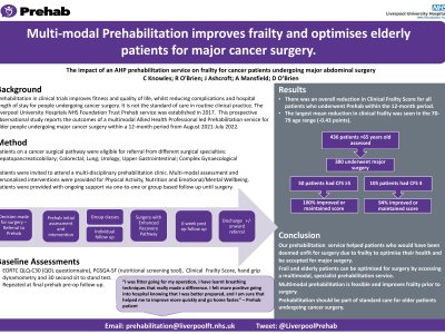 Background Prehabilitation in clinical trials improves fitness, improves quality of life, reduces complications, and reduces hospital length of stay It is not standard of care in routine clinical practice. This prospective observational study reports the outcomes of a clinical AHP prehabilitation service for older people undergoing major cancer surgery. Methods The LUHFT Prehab service commenced in August 2017, patients prior to major abdominal surgery for cancer were eligible for referral, this was inclusive of 8 different surgical specialties. Referred patients were invited to attend a multi