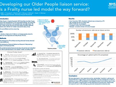 Introduction ‘Older People in Hospital Standards’ (2015) identifies that Older People should have care/treatment in the most suitable settings. In University Hospital Monklands (UHM) a liaison service was provided to frail patients who needed care outwith our older peoples’ wards (eg Surgical wards), led by clinicians (Consultant Geriatrician/ specialty doctor) twice weekly with support from Frailty nurses (FN). Patients were referred via multiple routes (email, letter, phone). Our aim was to develop a single point of referral, to increase capacity, be more responsive and FN led. Methods: We