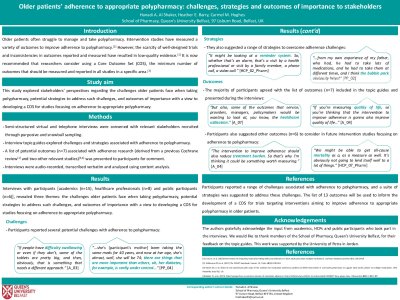 Introduction: Older patients often struggle to manage and take polypharmacy. Intervention studies have measured a variety of outcomes to improve adherence to polypharmacy. However, the scarcity of well-designed trials and inconsistencies in outcomes reported and measured have resulted in low-quality evidence. It is now recommended that researchers consider using a Core Outcome Set (COS); the minimum number of outcomes that should be measured and reported in all studies in a specific area. This study explored stakeholders’ perspectives regarding the challenges older patients face when taking