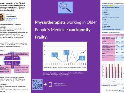 Introduction: Frailty is under-recognised in hospital leading to unwarranted variation in care. National guidance recommends that all healthcare professionals can identify frailty and offer interventions to reduce risk factors for frailty. Previously, physiotherapists working in Older People’s Medicine (OPM) did not record frailty status in their clinical assessment. This quality improvement project seeks to translate and implement best practice, supporting physiotherapists to record the Clinical Frailty Scale (CFS) score within routine patient assessment, so interventions can be initiated to
