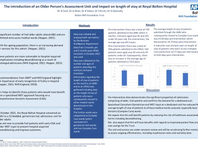 Introduction: Nationally, there have been increased attendances to hospital for older frailer adults. Recommendations from GIRFT and NHS England acknowledge the importance of identifying frailty, and the role that dedicated specialist services play. Best practice indicates when frailer adults receive a Comprehensive Geriatric Assessment (CGA), this reduces patient harm and improves outcomes. Locally in October 2022, Bolton NHS Trust converted an Acute Medical Assessment Unit (AMU) to a 22 bedded frailty unit, the Older Person’s Assessment Unit (OPAU) to provide older frailer adults with early