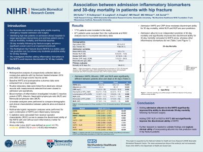 Introduction: Risk prediction tools help guide prognostic conversations and benchmarking in hip fracture care. The Nottingham Hip Fracture Score (NHFS) shows only moderate predictive ability for 30-day mortality. We assessed whether routine markers of inflammation could improve the discriminant ability of the NHFS to predict 30-day mortality following hip fracture surgery. Methods: We studied consecutive patients admitted with hip fractures at a large-volume trauma unit between 2015 and 2020. Baseline NHFS and postoperative outcome data were extracted from a local registry and linked to
