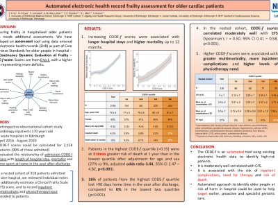 Background: Hospital Electronic Health Records (EHRs) increasingly capture health and functional deficits. We report outcomes for acute cardiac patients in relation to an automated frailty measure derived from these EHR data. Methods: We conducted a retrospective observational cohort study of consecutive cardiology admissions aged ≥70 years between April 2016 and August 2020, to three hospitals across Edinburgh, Scotland. The Continuous Dynamic Evaluation of Frailty (CODE-f) is an automated score between 0 (no markers present) and 1 (all present) representing 12 deficits generated from 31