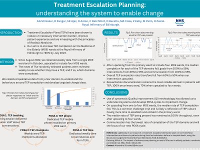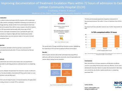 Introduction: East Lothian Community Hospital (ELCH) comprises of 95 medical beds for older patients undergoing rehabilitation following acute admission or discharge planning. Ideally, transfers from acute hospitals should have Treatment Escalation Plans (TEPs) in place, however only 67% of patients had a TEP documented electronically within three days of ELCH admission. Overnight and weekend cover is provided through nurse practitioners or Hospital at Night (off-site), therefore documented individualised plans by senior decision makers in the event of clinical deterioration is vital