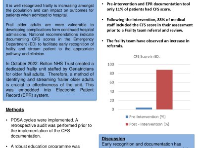 Introduction It is well recognized frailty is increasing amongst the population and can impact on outcomes for patients when admitted to hospital. Frail older adults are more vulnerable to developing complications form continued hospital admissions. National recommendations by GIRFT indicate CFS scores ought to be documented in the Emergency Department (ED) to facilitate early recognition of frailty and stream patient to the appropriate pathway and clinician. The aim of this is to ensure the correct Clinician reviews the frailer adult in the most appropriate setting and thereby reduce risk of