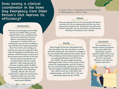 Introduction The Same Day Emergency Care Older Person’s Unit (SDEC OPU) provides urgent holistic care, complementing acute and community services to deliver comprehensive geriatric assessment. In October 2022, we introduced a new clinical coordinator role with the aim of improving patient flow. Prior to this role existing, one clinician per day was assigned to take referrals alongside reviewing their own patients, without having an overview of the processes and outcomes of the day. The new clinical coordinator role included taking referrals, vetting patients in A&E, assigning tasks to