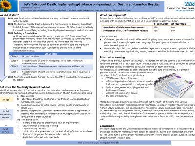 Introduction The National Quality Board published the first Guidance on Learning from Deaths in March 2017, which stated the aim of mortality review processes across NHS Trusts and provided a framework in identifying, reporting, investigating and learning from deaths in care. Homerton Healthcare NHS Foundation Trust considered how best to implement the Guidance: record mortality reviews, increase engagement within the Trust and disseminate learning. Method Whilst paper-based mortality reviews had already been conducted by some specialties, there was no Trust-wide process to record data and