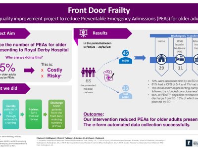 Background Up to 17.5% of admissions for older adults with frailty may be Preventable Emergency Admissions (PEAs). PEAs are costly and expose patients to complications including deconditioning, delirium, malnutrition and nosocomial infections. Royal Derby Hospital (RDH) has 1159 beds and cares for a population of around one million. The Frailty Emergency Assessment Team (FEAT) operates within the Emergency Department (ED) and Medical Assessment Unit. FEAT is multi-disciplinary, comprising nurses, physiotherapists and occupational therapists. Aim To reduce the number of PEAs for older adults