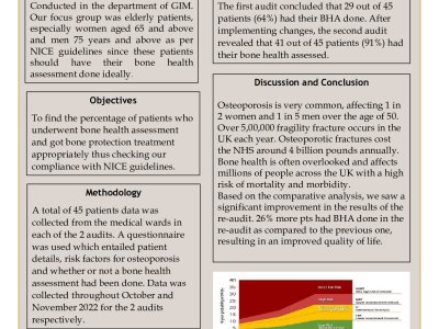 Title: Bone health assessment audit cycle at Queen Alexandra Hospital, Portsmouth (Audit ID 5474) Background: Conducted in the Department of General Internal Medicine. Our focus group was elderly patients, especially women aged 65 and above and men 75 years and above as per NICE guidelines since these patients should have their bone health assessment done ideally. Local problems: Osteoporosis is very common affecting approximately 3 million people. Over 5,00,000 fragility fracture occurs in the UK each year. Our audit aimed to find the percentage of patients who underwent bone health