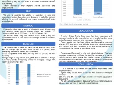 Introduction: Living with frailty is a risk factor for increased short and long term mortality. We aim to describe the uptake of escalation of care and resuscitation status discussions in frail older patients admitted to general, colorectal, and upper gastrointestinal wards. Methods: Prospective observational study of all patients aged 65 years and over admitted under general surgery 11th February to 11th March 2022 and a second cohort of patients hospitalised between 1st and 31st of October 2022. We scored frailty using the clinical frailty scale (CFS) and identified escalation of care