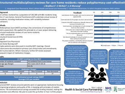 Background West Lothian has 17 care homes with 881 residents. General Practitioners (GP) undertake annual review of all residents, including medication review, with variability between practitioners. Introduction Multidisciplinary team (MDT) working is the cornerstone of comprehensive geriatric assessment. MDT meetings are an excellent environment for shared learning and discussion. We applied this principle to a 2-year project delivering structured MDT medication reviews of care home residents. Methods Funding was secured for a consultant geriatrician (0.5PA for 2 years, £6500 per year) to