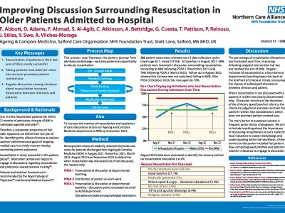 Introduction: One in three hospitalised patients die within 12 months of admission, rising to 45.6% in individuals aged 85 and older. Resuscitation is rarely successful in this patient group. Most older persons are happy to engage in discussions regarding resuscitation and patients' and relatives' involvement is recommended by the General Medical Council and Royal College of Physicians. We aimed to increase the number of resuscitation and escalation of care discussions across our Ageing and Complex Medicine department to 90% by November 2022. Method: Retrospective review of randomly selected