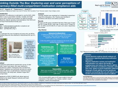Introduction: Medication non-adherence is estimated to cost the NHS >£500 million a year in preventable morbidity, mortality and health service use. Multi-compartment medication compliance aids (MCAs) are provided in an effort to promote adherence, despite opposing recommendations from NICE and the Royal Pharmaceutical Society. This study aimed to understand the views of patients and carers of MCAs, including those who have declined or discontinued the use of a pharmacy-filled medication compliance aid (pMCA). Method: A researcher-administered questionnaire survey of older adults (“users”) and