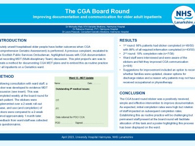 Background Acutely unwell hospitalised older people have better outcomes including mortality and functional status when CGA (Comprehensive Geriatric Assessment) is performed. A previous complaint, escalated to the Scottish Public Services Ombudsman, highlighted issues with CGA documentation and recording MDT discussion. This pilot project’s aim was to create a method for documenting CGA MDT plans and to embed this as routine practice for all inpatients on a Geriatrics ward. Method Following consultation with staff on this ward, a sticker was developed detailing status of medical and therapy