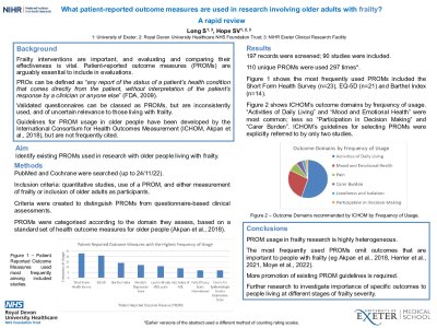 Introduction: The need to develop and evaluate frailty-related interventions is becoming more pertinent as life expectancy increases. Patient-reported outcome measures (PROMs) are arguably essential in this field of research, and can be defined as “ any report of the status of a patient's health condition that comes directly from the patient, without interpretation of the patient's response by a clinician or anyone else” (FDA 2009). Numerous validated questionnaires can be classed as PROMs, but seem inconsistently used, and of uncertain relevance to/for those living with frailty. This rapid