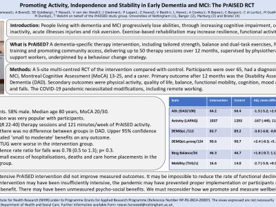 Introduction People living with dementia and MCI progressively lose abilities, through increasing cognitive impairment, co-morbidities, inactivity, acute illnesses and injuries. Rehabilitation therapy may reduce disability and falls and increase resilience. Methods We co-produced a therapy intervention, comprising strength, balance and dual-task exercises, functional activity training and promoting community access, providing up to 50 therapy sessions, delivered over 12 months and underpinned by a behaviour change strategy. We evaluated the intervention in a 5-site multi-centred Randomised