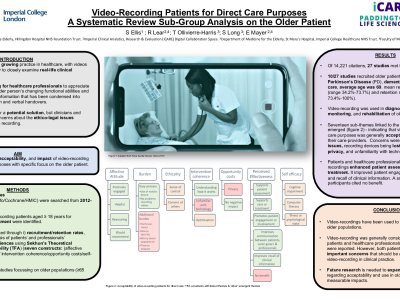 INTRODUCTION Video-recordings of patients may offer advantages over text-based documentation to supplement assessment and decision-making – particularly for older patients with complex needs. Our systematic review aimed to evaluate the application, acceptability, and impact of video-based records; here we highlight current evidence on using video-recordings to support direct care delivery for older patients. METHODS Five electronic databases (Medline/Embase/PsycInfo/Cochrane/HMIC) were searched from 2012-2022. Studies involving videorecording patients aged ≥ 18 years for diagnosis, care, or