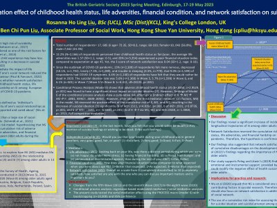 Introduction: The study is to explore how childhood health status ( X), early life adversities ( M1), financial condition ( M2), and satisfaction with social networks ( M3) are associated with the development of suicidal ideation ( Y) over time among older adults in 13 European countries. Respondents were drawn from the Survey of Health, Ageing, Retirement in Europe (SHARE) conducted in 2013 (Wave 5), 2015 (Wave 6), 2016 (Wave 7), and 2020 (Wave 8). 56.8% (n=10043) of respondents were female, and 43.2% (n=7642) were male. The mean age at Wave 8 was 72.35 (range 60-103). Method: The conditional