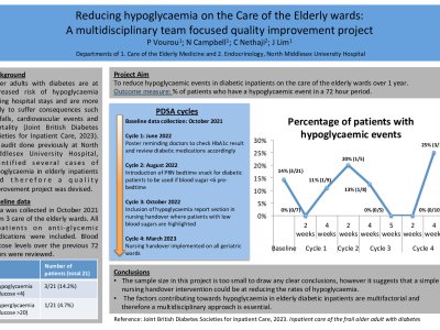 Introduction Older adults with diabetes are at increased risk of hypoglycaemia during inpatient hospital stays. It was noted that a large proportion of diabetic patients on the care of the elderly wards at North Middlesex University Hospital were experiencing hypoglycaemia so a quality improvement project was devised to address this issue and improve patient safety. Method Baseline data was collected in October 2021 by monitoring the glucose levels of 21 diabetic inpatients across three care of the elderly wards over a 72-hour period. The project consisted of 3 interventions introduced on one