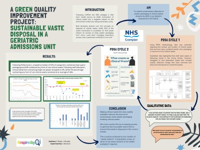 Introduction: Following COP26, the NHS pledged a ‘Net Zero’ health service by 2040. Incineration of clinical waste has a negative impact on the environment whilst also being extremely costly. NHS Grampian spends over £1m annually on disposal of clinical waste, whilst 20% of the waste incinerated is unsuitable for that waste stream. An excess of clean plastic packaging from visors, used when managing respiratory viruses, was a particular contributor in our unit. To improve sustainability, the aim of this quality improvement project was to reduce unnecessary disposal of plastic packaging in