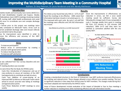 Introduction Whitehills Health and Community Care Centre (WHCCC) is a 31-bed community hospital. Weekly multidisciplinary team (MDT) meetings occur to co-ordinate care and discharge planning. The format prior to this quality improvement project was meetings twice per week using Microsoft Teams. Errors were noted such as incorrect discharge dates and missed referrals. Aims: improving information transfer during MDT meetings, reducing errors in communication, reducing meeting duration and improving staff satisfaction. Methods Data was collected in the format of surveys distributed to members of