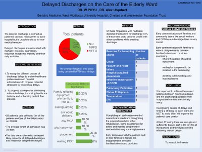 Introduction : The delayed discharge is defined as patient is deemed medically fit to leave hospital but is unable to do so for non-medical reasons. Delayed discharges are associated with mortality, infection, depression, reduction in patients' mobility and their daily activities. Aim and Objectives: 1.Recognition of different causes of discharge delays will allow health professionals, hospital administrators to propose potential strategies for minimising delays. 2.To identify causes of prolong delays in discharge among elderly patients.3. To propose strategies for eliminating advisable delays