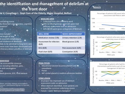 Delirium is common especially in the older adult (≥65 years) and is characterised by disturbed consciousness, cognitive function or perception. It develops acutely, often has a fluctuant course and is associated with several adverse outcomes including increased length of hospital stay, increased mortality and increased incidence of developing dementia. Delirium is under-recognised, however assessment tools such as 4AT and abbreviated mental test score (AMTS) have been developed to help clinicians assess for the presence of delirium. The “TIME” bundle developed by Healthcare Improvement