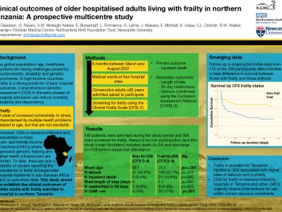 Background: As global populations age, healthcare systems are facing challenges posed by multimorbidity, disability and geriatric syndromes. In high-income countries, frailty is a strong predictor of poor hospital outcomes. Comprehensive Geriatric Assessment is effective but resource-intensive and unavailable in sub-Saharan Africa where specialist geriatric training and allied health infrastructure are limited. Objective: To establish clinical outcomes of older adults with frailty admitted to hospital in northern Tanzania.= Methods: All adults aged ≥60 years admitted to medical wards at four