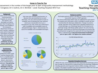 Introduction: Discharging patients from hospital is a complex process which requires multiple professions and processes. Late afternoon discharges can lead to admission bottlenecks and contribute to emergency department overcrowding. Focusing on discharging patients earlier in the day, can contribute to greater flow through the hospital and greater patient satisfaction. Leeds Teaching Hospital Trust (LTHT) aims to achieve 70% of discharges before 3pm. The Specialist and Integrated Medicine (SIM) department care for frail elderly patients who are at increased risk of harm following prolonged